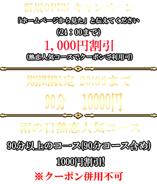 2025/10/26 雨割60分以上コース1000円0ff!昼割のみ併用可、合計2000円オフ!!